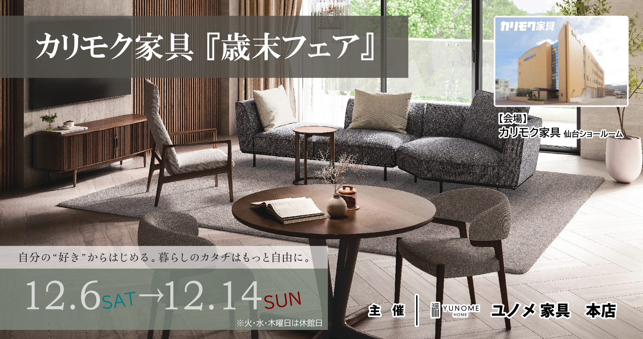 カリモク家具『歳末フェア』開催期間12月6日(土)〜12月14日(日) ※火・水・木曜日は休館ユノメ家具がお送りするカリモク家具のイベントのご案内です。 12月6日(土)から12月14日(日)までカリモク家具仙台ショールームにて『カリモク家具歳末フェア』を開催いたします。 木へのこだわり、家具…